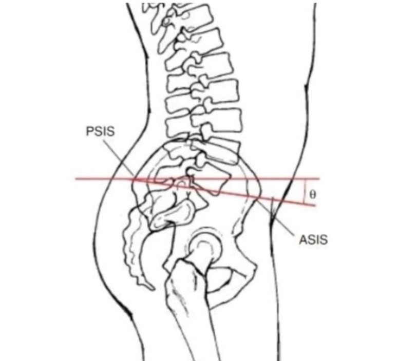 보통 PSIS가(후상장골극) ASIS(전상장골극)보다 5~12º정도 높게 위치해 있어야 정상 범위로 간주한다. 각도를 재었을 때 5º보다 낮으면 후방경사라고 진단할 수 있다. 반대로 12º이상 더 높다면 전방경사로 볼 수 있다.