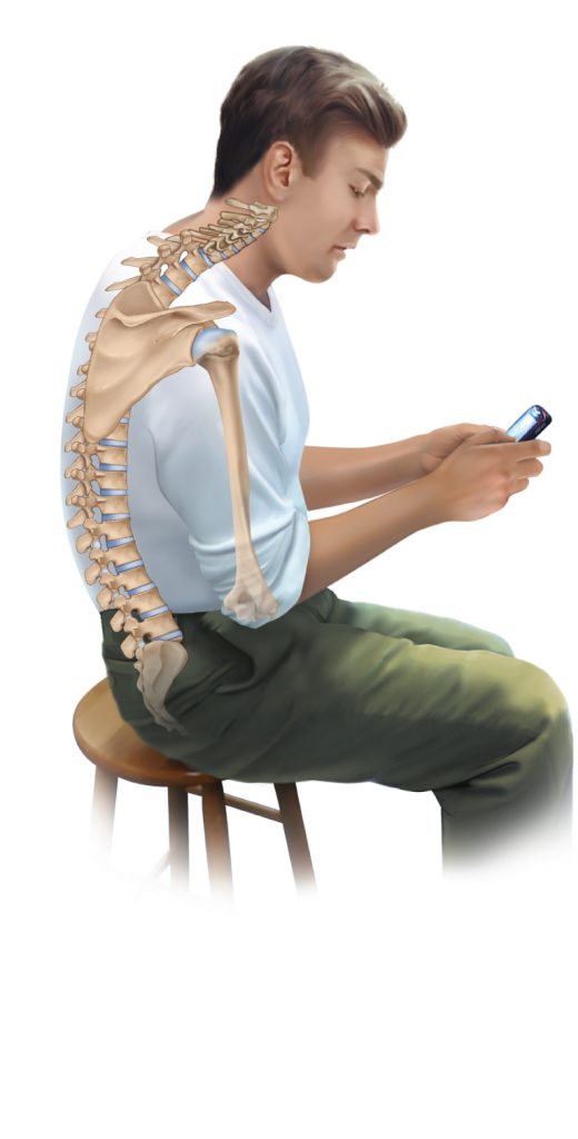 위 사진 처럼 스마트폰이나 컴퓨터를 할 때에, 목이 앞으로 길게 빠지며 자연스럽게 힘이 풀리며 등이 굽게 됩니다.