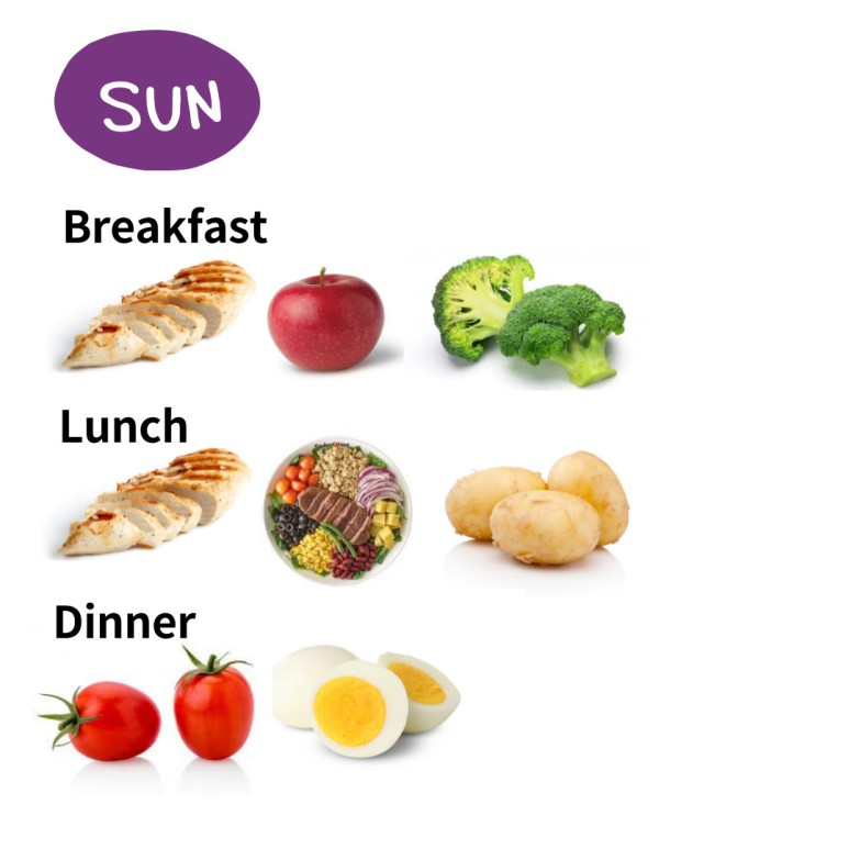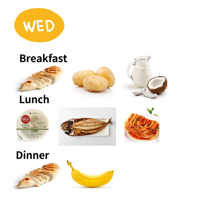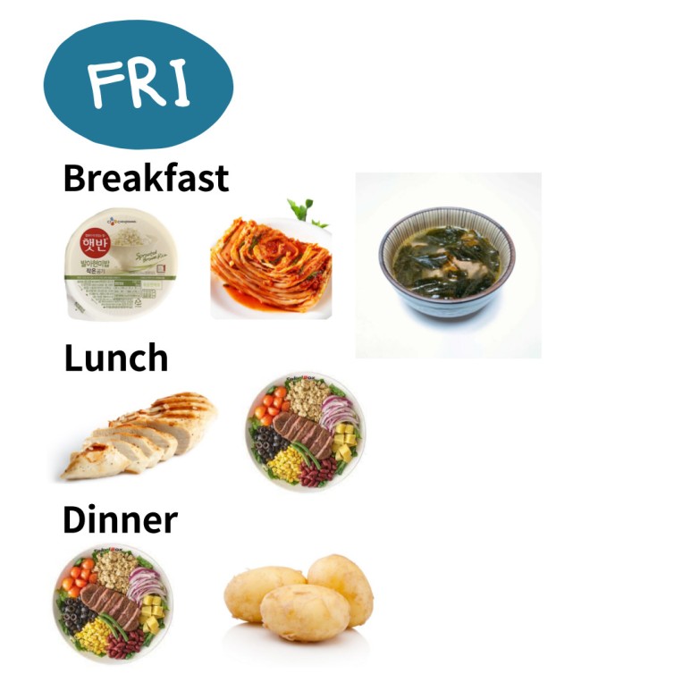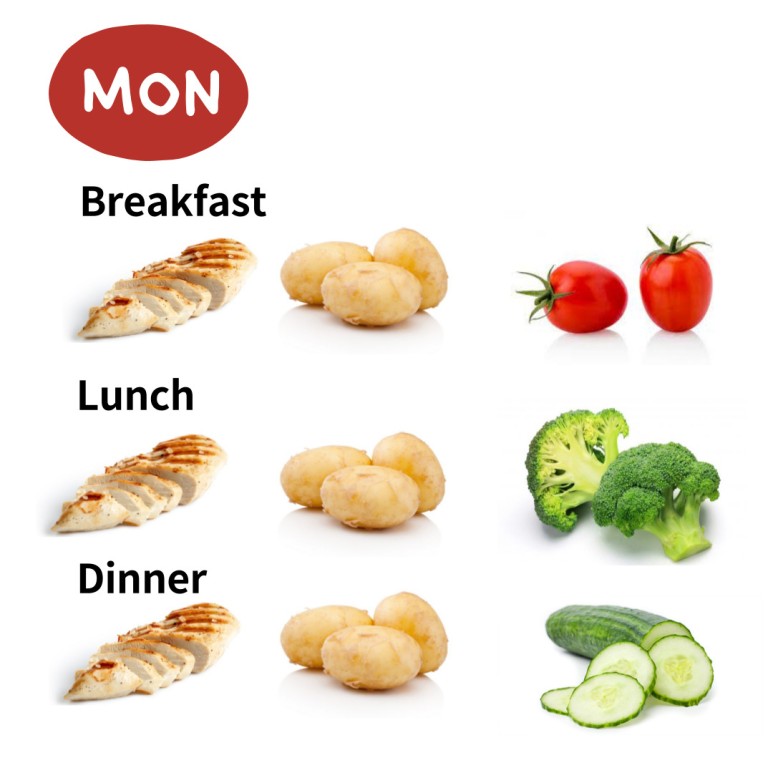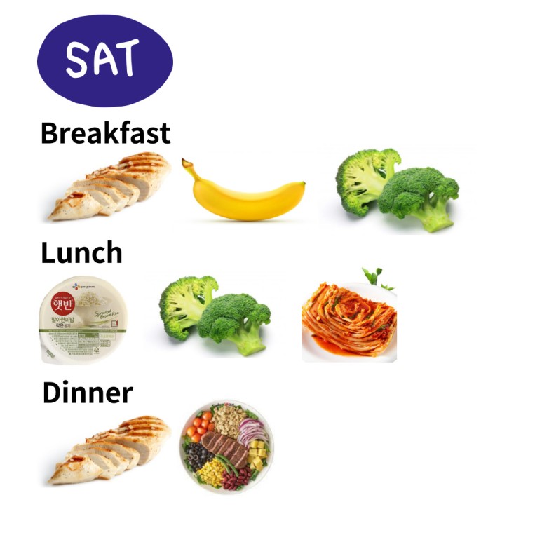 닭가슴살 100g / 감자2개 / 방울토마토100g / 브로콜리반개 / 오이한개