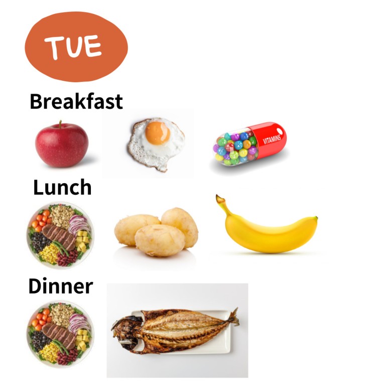 사과1개 / 계란프라이 / 비타민 / 샐러드or샐러드볼 / 바나나1개 / 자반고등어구이 반토막